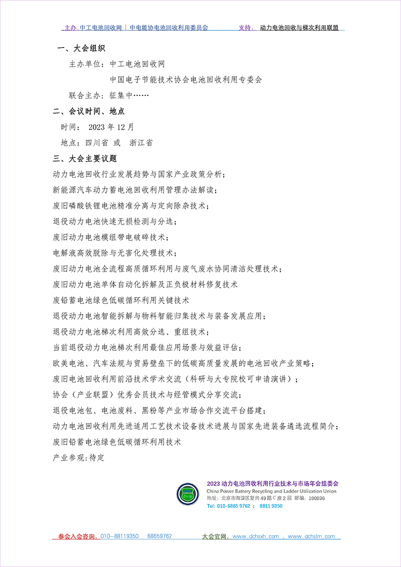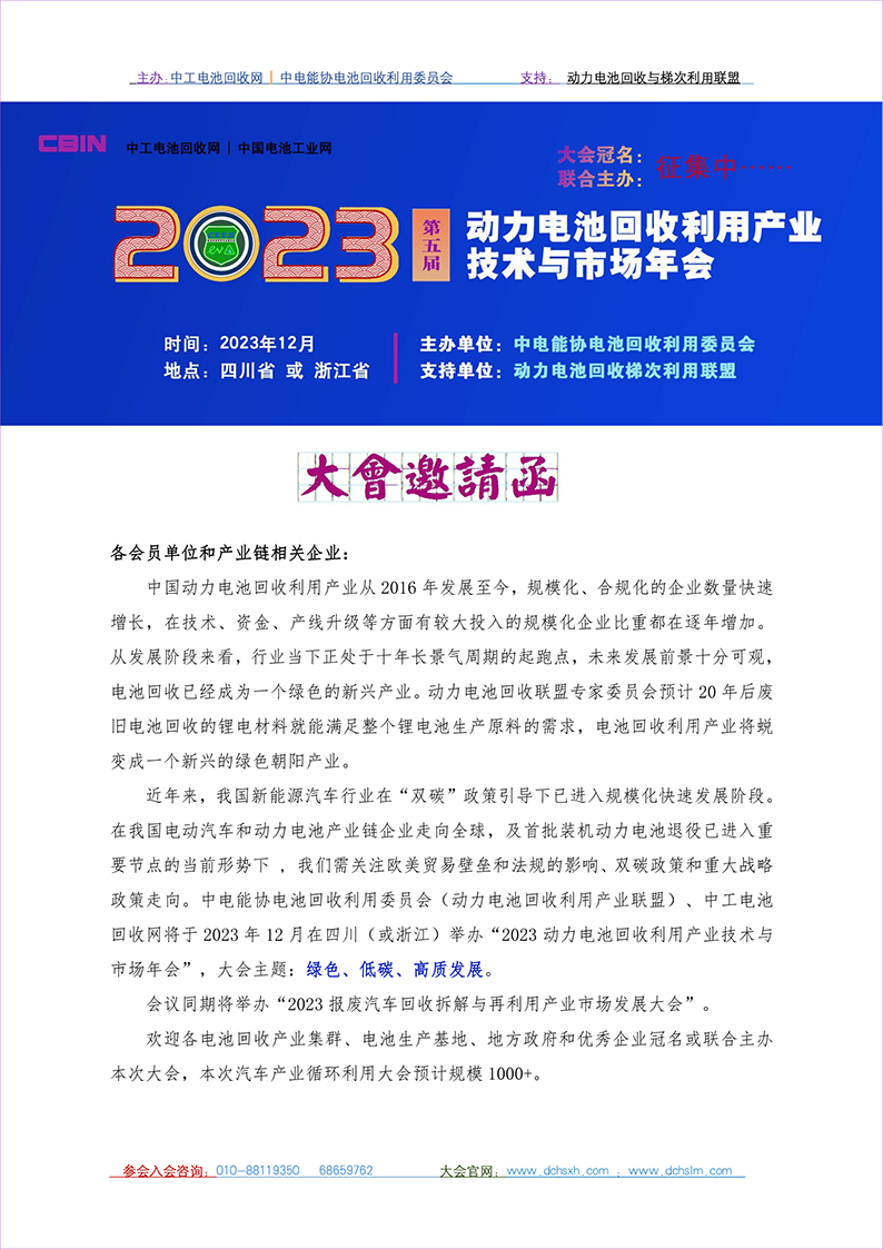 中電能協(xié)電池回收利用委員會(huì)(動(dòng)力電池回收利用產(chǎn)業(yè)聯(lián)盟)、中工電池回收網(wǎng)將于2023年12月18-19日將在四川(或浙江)舉辦“2023動(dòng)力電池回收利用產(chǎn)業(yè)技術(shù)與市場(chǎng)年會(huì)”,大會(huì)主題:綠色、低碳、高質(zhì)發(fā)展。 會(huì)議同期將舉辦“2023報(bào)廢汽車回收拆解與再利用產(chǎn)業(yè)市場(chǎng)發(fā)展大會(huì)”。